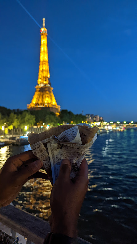 We were flying by the seat of our pants. Then we returned to the Eiffel Tower because one of our friends said we had to eat a crepe while looking at the Eiffel Tower. Little did we know that a light show happens; we were in awe. Sitting there, eating a crepe, watching a light show, it was true luck to have our flights canceled earlier that morning.